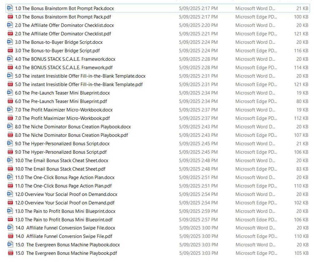 The Ultimate AI Bonus Creation Arsenal isn’t just another PLR bundle — it’s a complete system that gives you plug-and-play tools to create persuasive affiliate bonuses that convert. Here’s what’s inside: